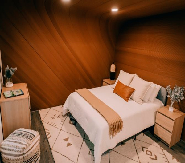 Топлите дървени подове и стени на BioHomeD на BioHomeD му придават блясък, модерен вдъхновена от скандинавските дървени трупи.